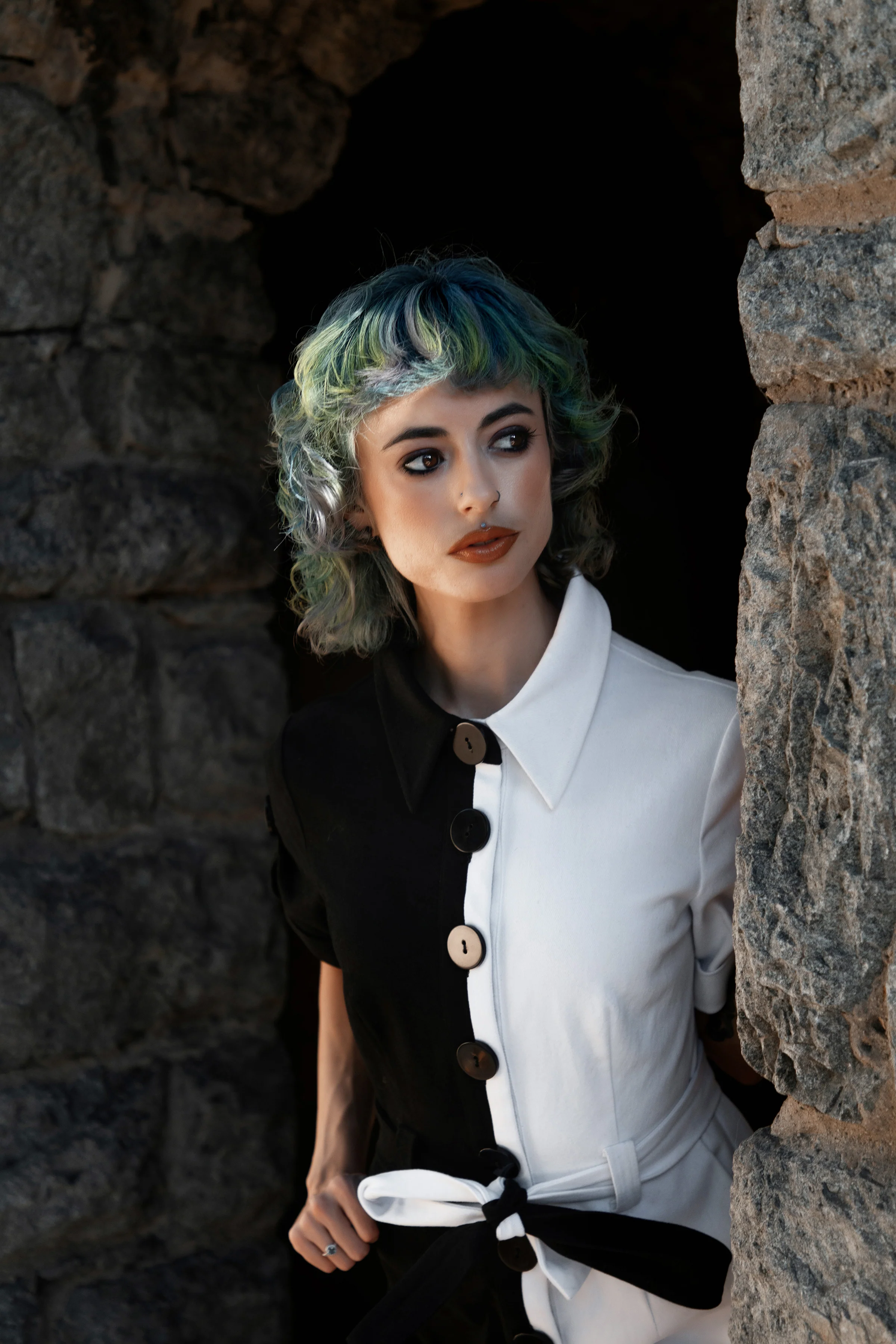 Details: Button-down front, belted waist tie, structured collar, straight-leg cut, bold two-tone contrast design
